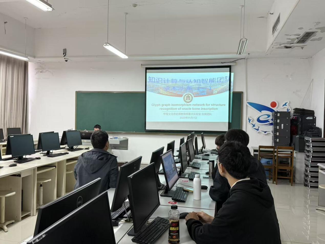 2025年11月7日下午,应我院熊晶教授邀请,甲骨文信息处理教育部重点实验室张展教授在JS320教室作了题为“Glyph Graph Isomorphism Network for Structure Recognition of Oracle Bone Inscription”的学术报告。报告采用线上线下相结合方式举行,由熊晶教授主持。来自甲骨文信息处理教育部重点实验室、临沂大学信息科学与工程学院及我院知识计算与认知智能科研团队的30余名师生参加了本次活动。