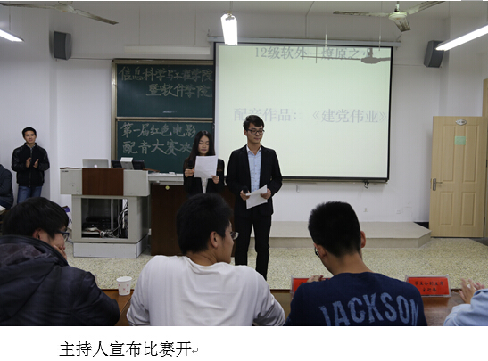 2012级软外第一个入场,为《建党伟业》配音,最终以一首清扬的红歌结尾;12级软一浏阳河队为《辛亥革命》配音,本片中表演者的哭声成为一大亮点,赢得了一阵阵掌声;13级计二少年先锋队献上《建党伟业》,电影气氛凝重,中间一声尖叫打破沉寂,这声尖叫也成了此表演中标志性的一点,其余各组表演同样引人注目。“有奖竞猜”活动中各选手及评委积极参与,十本精致的纪念笔记本落入答题者的手中,此项活动也为比赛注入了活力。经过最终的比拼,12级计二铁道游击队摘得桂冠,其余组合获得二等奖三等奖优秀奖。