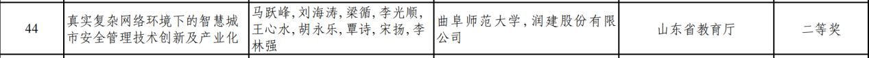 马跃峰教授团队联合润建股份有限公司共同参与完成的“真实复杂网络环境下的智慧城市安全管理技术创新及产业化”项目,获得山东省科技进步二等奖。项目聚焦于解决智慧城市建设中的安全管理问题,提出了创新性的技术解决方案,并成功实现了产业化应用,显著提高了城市的安全管理水平。