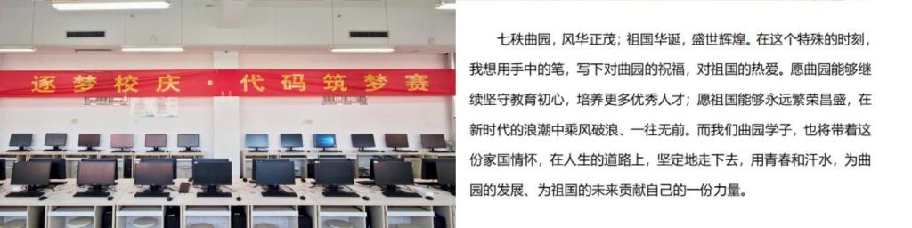 团委学生会充分发挥创意,组织开展了一系列独具特色的校庆主题活动。在校歌《犁牛之子》二次创作中,同学们为经典注入新时代活力;“祖国荣光映杏坛,七秩曲园谱新篇” 主题征文活动,同学们用文字记录与曲园的难忘故事;“逐梦校庆,代码筑梦赛”编程比赛,让学子以代码为笔、以科技为墨,为校庆增添了一抹亮丽的科技色彩。