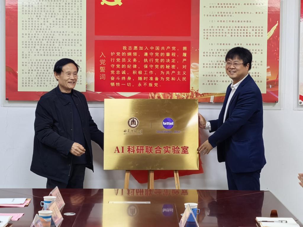 刘刚与曹现贵共同为“AI科研联合实验室”揭牌,李光顺与曹雪分别代表双方签署战略合作协议。