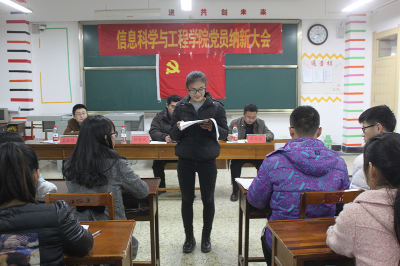 为进一步完善学院党员队伍建设,2015年12月10日晚7点,信息科学与工程学院党员纳新大会于C407拉开序幕。信息科学与工程学院党总支副书记颜景民,团总支书记毕文波,辅导员姜振栋老师出席并参加了此次会议。