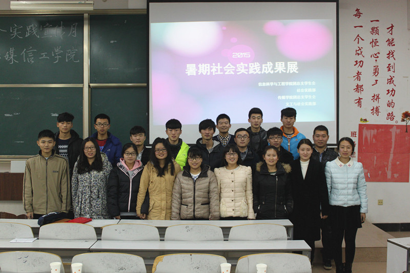 为响应校社会实践部的号召,加强信息科学与工程学院与传媒学院的交流与沟通,展示两院的暑期社会实践活动成果。2015年11月25日下午2点30分左右,暑期社会实践成果展之信工传媒在E303拉开序幕。校社会实践部部长张亮及各院社会实践部部长等担任评委,两院的团总支学生会主席团成员与同学们一起观看了本次暑期社会实践成果展。