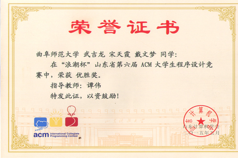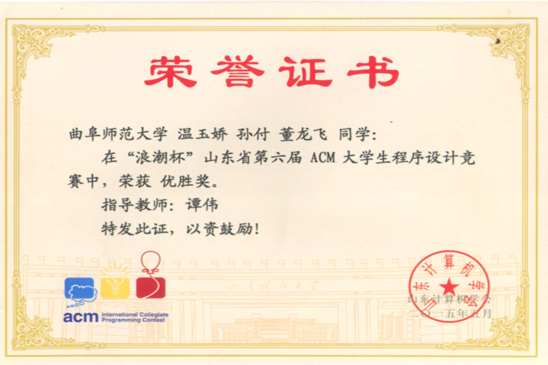 ACM是计算机协会-国际大学生程序设计竞赛的简称,是由国际权威组织ACM主办的世界上公认的规模最大、水平最高的国际大学生程序设计竞赛,享有“程序设计的奥利匹克”美誉。大赛是在全英文的考试环境下,一个3人团队应用一台计算机在规定时间下解决6到8个实际问题。这对同学们的各方面能力要求很高。本次比赛学院组织6名同学组成两个小队进行参赛,均获得了大赛优胜奖。