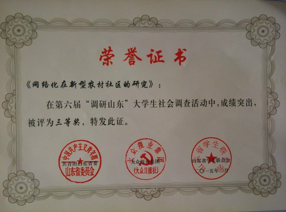 课题《网络化在新型农村社区的研究》在第六届“调研山东”大学生社会调查活动中获得省级三等奖。