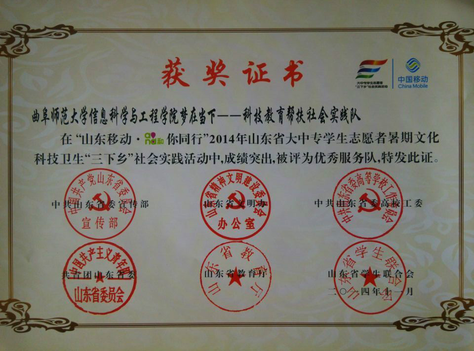 2013-2014学年信息科学与工程学院“梦在当下——科技教育帮扶社会实践队” 在“山东移动和你同行”2014年山东省大中专学生志愿者暑期文化科技文生“三下乡”社会实践活动中被评为优秀服务队。