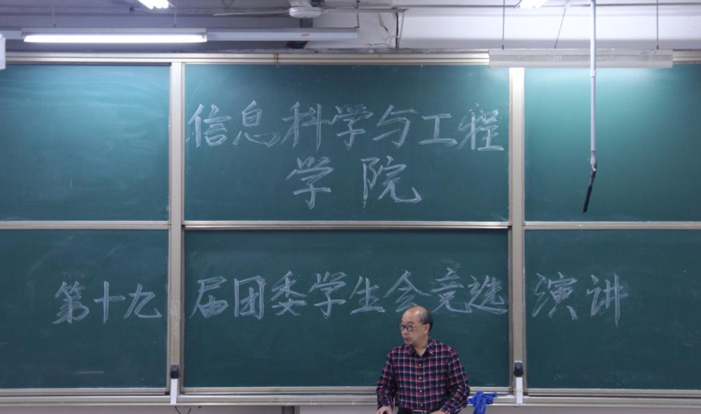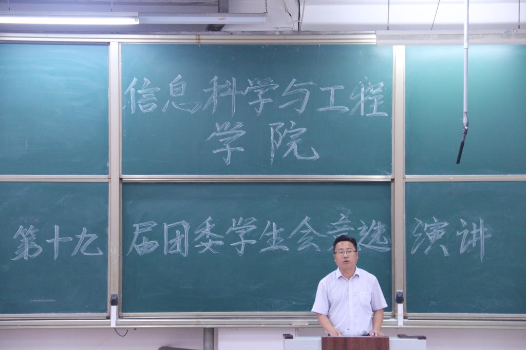 5月26日上午八点,信息科学与工程学院第十九届团委学生会换届竞选于JE305进行。信息科学与工程学院党委副书记肖龙航,团委书记毕文波、本科生党支部书记于运清、辅导员鲁瑞丽出席此次会议,信息科学与工程学院第十八届团委学生会全体成员参加本次会议。