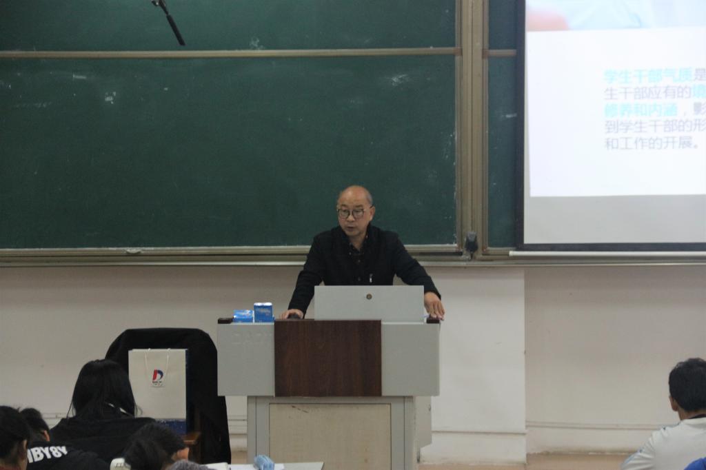 课程伊始,肖书记指出学生干部要具备基本的境界、修养、品行、定位四个基本素质,这四个基本素质是学生干部成长的思想指导、精神纲领和行动指南,是学生干部发展的软实力。学生干部还要有气质,气质是一个人内在意蕴的外在表现,是个人品行、学识、能力、地位等个人内涵和社会塑造的综合表现,并从处事沉稳、做事心细、富有胆识、为人大度、待人诚信、勇于担当、成熟心态和底蕴魄力等具体表现上进行详细阐述,引导学生干部提升自身素质,提高自身修养。最后,肖书记希望学生干部能够提升自己的软实力,保证自己的全面发展,努力改善、推进、提高我院学生管理工作水平。
