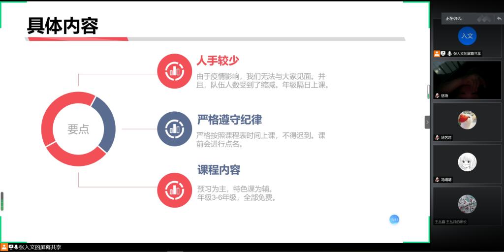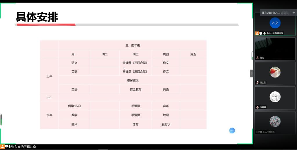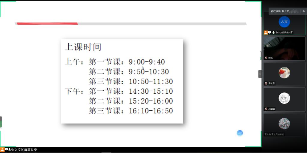 会议伊始,张入文向家长们介绍了“先生计划”教育关爱服务团的性质、人员构成以及过往支教经历,通过播放过往支教拍摄的一个视频,让家长们对“先生计划”教育关爱服务团有了初步的了解和印象。家长会由四个部分组成。第一,交代注意事项。在活动开展期间,家长要保证学生在家的设备使用安全;同时,有的学生自制力较差,需要家长适当监督,避免出现学生玩游戏的情况;其次,学生要保证衣着得体,对此次线上教学要有足够的仪式感。第二,说明具体内容。队伍人数受限,故教学组决定对年级隔日上课,以保证教学的质量。学生在上课期间要严格遵守课堂纪律,不得迟到,老师会在课前进行点名,以保证学生的到课率。教学组通过多方面研讨,决定使用腾讯会议这一平台授课。课程内容也是十分合理,以预习为主,特色课为辅,力求让每一位学生收获知识和快乐。第三, 说明具体安排。张入文向家长们展示了各个年级的课程表以及具体上课时间,并作了相关解释说明。第四,为了充分解决家长的疑惑,此次会议设定了提问环节。一位家长对此次线上教学活动表达了由衷的喜悦和感谢,希望通过此次教学活动,孩子的学习水平能有所提高,其孩子也对此次线上教学展现了很高的积极性。对于家长们提出的问题,张入文一一耐心细致地为其解答。