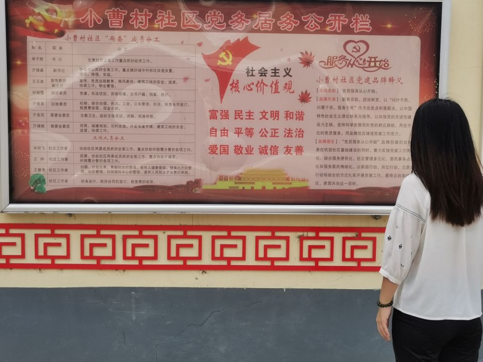 总体上社区的党务建设已经处于稳定期。队员们了解到了社区的建设、管理和发展的总体情况,认知有关社区的规划建设。小曹村社区秩序井井有条、目标明确,企业联动创新发展,释放着生生不息的活力。这更加印证了基层党组织的重要性。