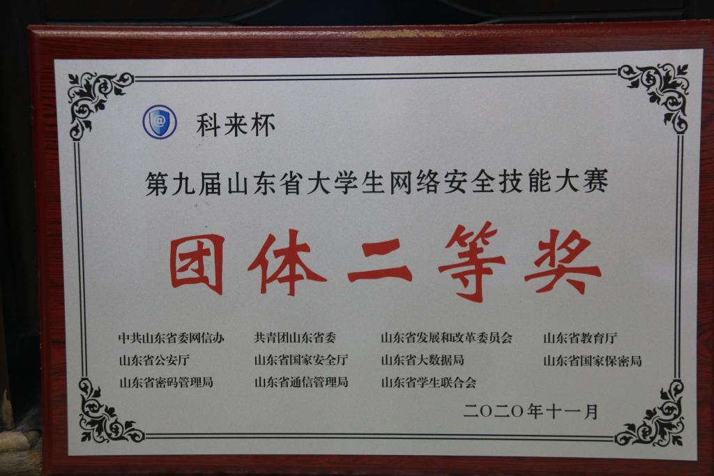 2020年11月7日—9日,“科来杯”第九届山东省大学生网络安全技能大赛在山东大学青岛校区举行。我院由黄富能、张超、郭良澳组成的团队获得团体二等奖,张超、黄富能获个人三等奖。
