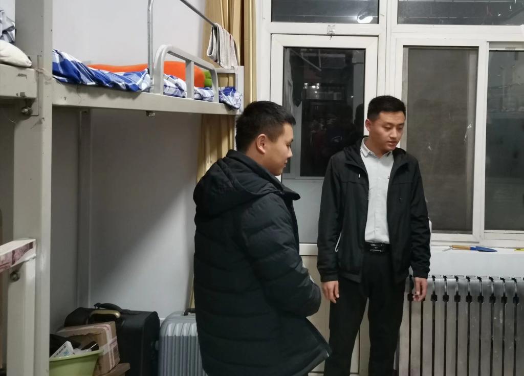 本科生党支部书记于运清、辅导员纪玉超、刘兆宇、孙宇带领综合检查小组对宿舍进行安全卫生检查。