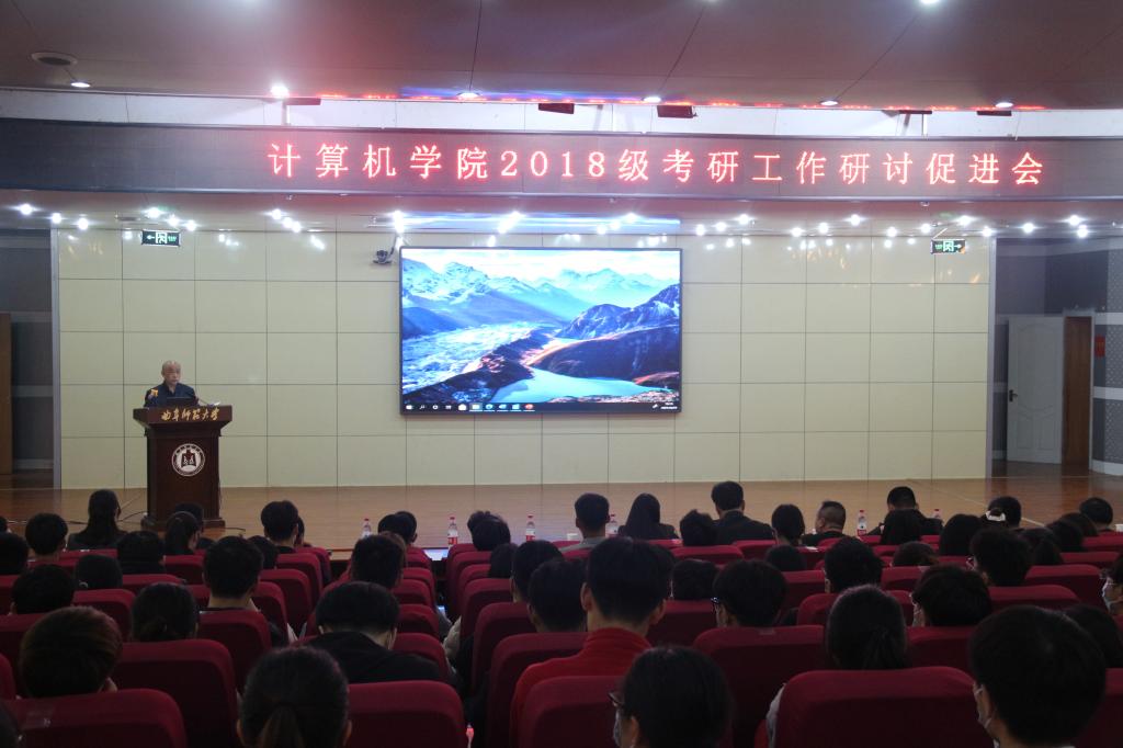 在图书馆报告厅举行2018级考研工作研讨促进会。会议由学院党委副书记肖龙航主持,教务处副处长熊吉忠、学工处副处长郑勇、学工处就业指导中心主任曲涛、网络工程系主任刘效武、计算机科学与技术系主任雷玉霞、辅导员于运清、孙宇、纪玉超、2018级全体同学及部分家长代表参加此次会议。
