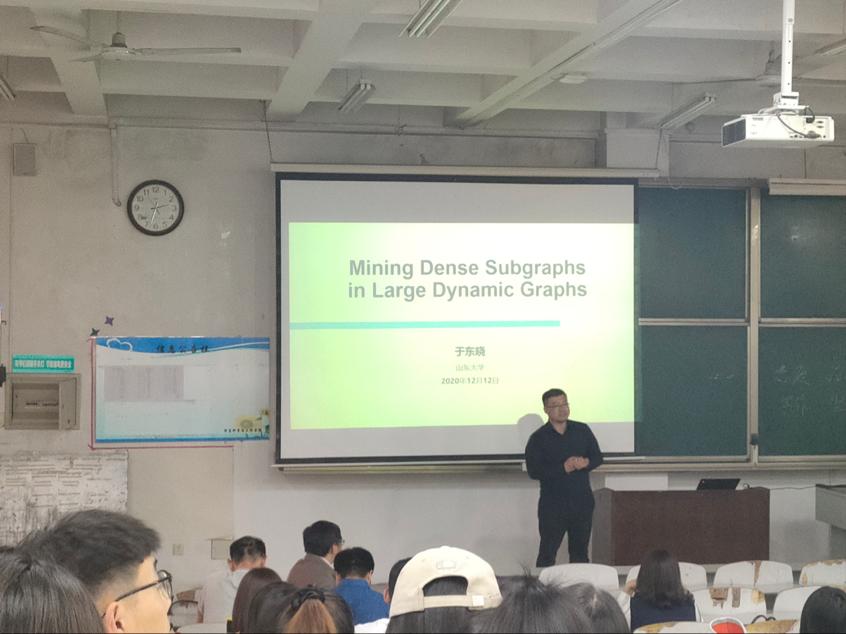 会议伊始,副院长李光顺教授对于东晓教授作了介绍。于东晓教授是山东大学“齐鲁青年学者”特聘教授,博士生导师。主要研究方向为分布式计算、无线网络、数据挖掘、机器学习理论等。随后,于教授先做了《Mining Dense Subgraphs in Large Dynamic Graphs》学术报告,然后又从态度、品质、方向、写作、坚持五个方面就如何写好学术论文进行了详细阐述,为同学们分享了写作技巧及宝贵经验。接下来,于教授和老师同学们展开互动,并耐心解答了大家科研上的困惑。最后,李院长对此次报告进行了总结发言,表达了对于教授的感谢以及对同学们的期许。报告会在热烈的掌声中落下帷幕。