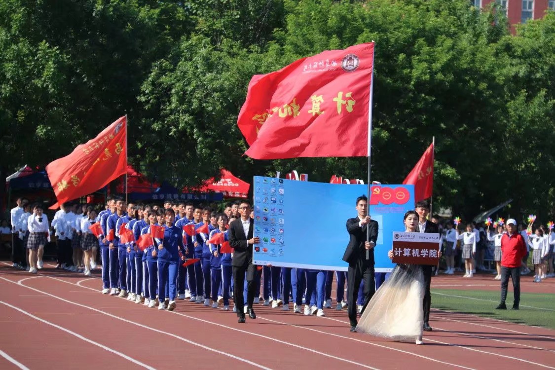伴随着振奋人心的《运动员进行曲》,国旗护卫队精神抖擞,意气风发,阔步经过主席台接受领导和老师的检阅。随后,计算机学子身着蓝色院服踏着整齐划一的步伐,高举院旗走向主席台,他们以整齐划一的步伐向大家展现了计算机学子特有的朝气,同时也向大家展示计算机学子的自信与热情。“扬帆起航,劈波斩浪。计算人才,编译未来。 ”的高亢嘹亮的口号向我们展现出昂扬的精神风貌。方队入场后,进行升旗仪式,五星红旗在全校师生的注目下冉冉升起。最后,全体师生共同观看开幕式文艺演出。我院学子表演青春向上的广播体操,表演者用自己的热情感染着现场的每一个人,更把整个开幕式的气氛推向高潮。