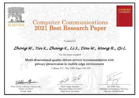 2018级硕士研究生仲伟艺为第一作者(通讯作者:齐连永)的论文《Multi-dimensional Quality-driven Service Recommendation with Privacy-preservation in Mobile Edge Environment》从该期刊去年发表的600余篇论文中脱颖而出,荣获2021年度唯一一篇“最佳研究论文奖”(2021 Best Research Paper Award)。 《Computer Communications》是中国计算机协会推荐的C类期刊,在计算机通讯领域享有广泛的声誉。论文自发表以来,受到国内外学者的广泛关注,2021年3月起持续入选ESI高被引论文及ESI热点论文。本次获奖标志着我校斗地主