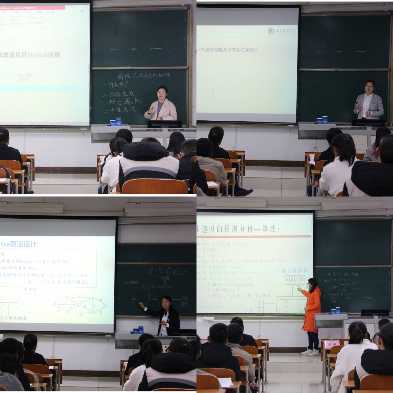 本次大赛统一现场抽签、统一比赛流程、统一评比标准,采用现场打分的形式展开。各位青年教师紧扣教学目标,融合思政教育,熟练运用多媒体等现代教学手段,围绕学情分析与重点难点步步推进,教学风格各具特色。于海荣老师的《非递归的预测分析》详细具体,注重教学结合;李圣君老师的《单源最短路》以丝绸之路为背景,形象生动,深入浅出;胡越梅老师的《秘密共享密码体制》结合案例分析,清晰明了,逐层深入;李凤老师的《高等数学》以等边三角形为引入,将问题形象具化,易于理解;袁莎莎老师的《图像滤波及其Matlab仿真》以图片导入,教态自然大方,语言生动风趣;靳绍珍老师的《传感器的基本特性》直接明了,专业性强;宋扬老师的《推荐系统》问句开头,带着问题走入教学,引人入胜;黄万丽老师的《哈夫曼编码》历史开篇,循循善诱……