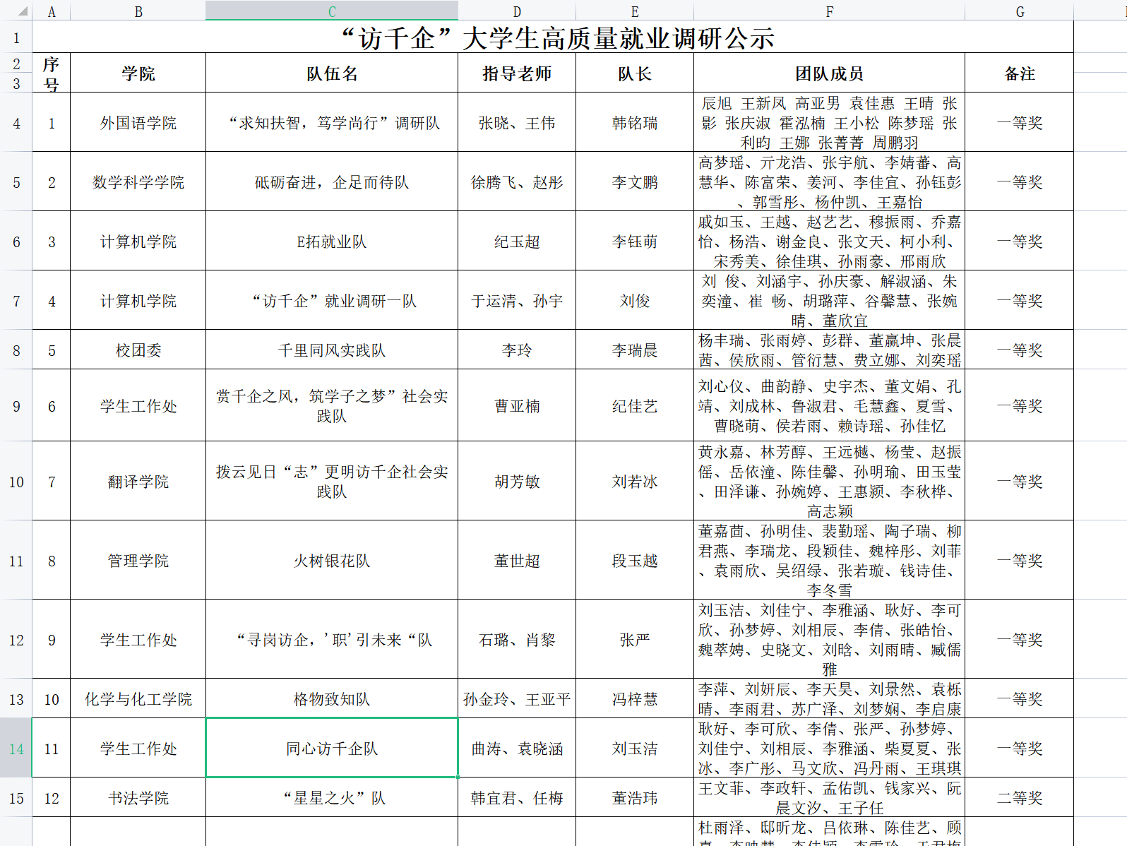 本次活动经学生工作处、校团委统一评定,评选出一等奖11个、二等奖17个、三等奖26个,其中由于运清老师和孙宇老师指导的“访千企”就业调研一队以及由纪玉超老师指导的E拓就业队荣获一等奖,由孙宇老师和纪玉超老师指导的“访千企”就业调研二队荣获二等奖。