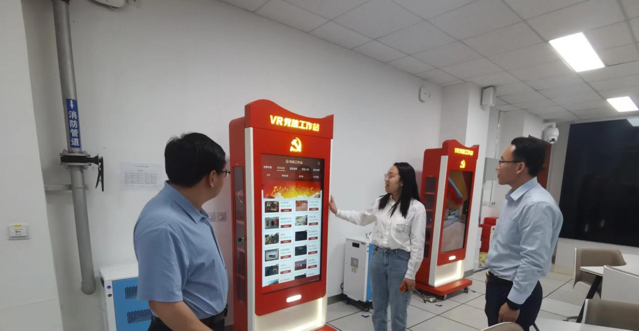 调研组参观了山东大学计算机科学与技术学院VR党建工作站,通过专业融合,联合多个学科和企业,通过数字化时代的新型展示方式,让学生随时随地学党史、学红色精神、学理论知识,更深入地了解到红色历史与文化,传承红色革命精神。