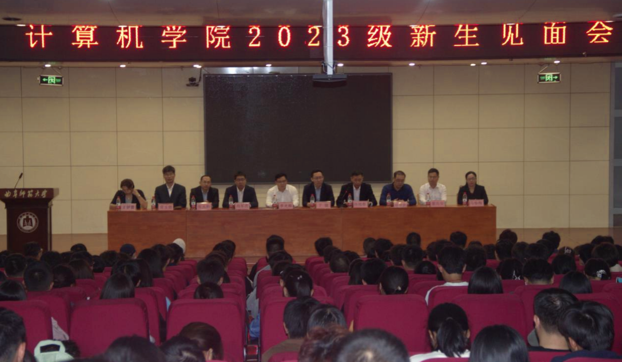 2023级新生见面会于2023年10月11日下午两点三十分在图书馆报告厅召开。出席本次会议的有学院党委书记于健、院长李光顺、党委副书记孙旭春、副院长刘效武、副院长尚军亮、人工智能系主任雷玉霞、网络工程系主任马春梅、数据科学与大数据系主任董兆安、计算机科学与技术系主任张元科、优秀教师代表王伊蕾,会议由党委副书记孙旭春主持。