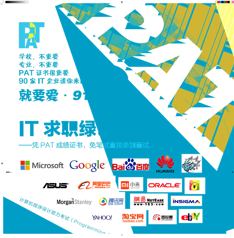 PAT考试是由浙江大学计算机科学与技术学院创办并由高等教育出版社有限公司独家运营的计算机程序设计能力考试(Programming Ability Test,简称PAT),旨在培养和展现学生分析问题、解决问题和计算机程序设计的能力,科学评价计算机程序设计人才,为IT企业选拔人才提供参考标准,目前联盟企业有100多家,包括Google中国、Microsoft、华为、雅虎、百度、腾讯、阿里巴巴、淘宝(中国)、奇虎360等国内顶尖的IT企业都已划定免笔试PAT分数线,这些企业每次收到数据包后会主动联系考生,所以“PAT就是IT界的托福”,一次考试相当于通过N家公司的笔试,证书2年内有效。通过PAT认证考试可以为自己早日开启就业的绿色通道。我院学生在今年3月份举行的首届PAT考试中就取得可喜的成绩,通过率居全国同类学校前茅,全国总共十多个甲级满分名额中就有我们的一席之位。