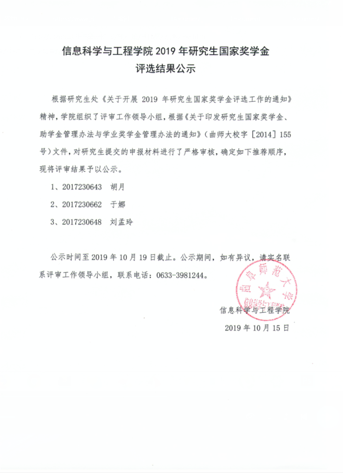 上一条: 信息科学与工程学院优秀研究生干部名单公示