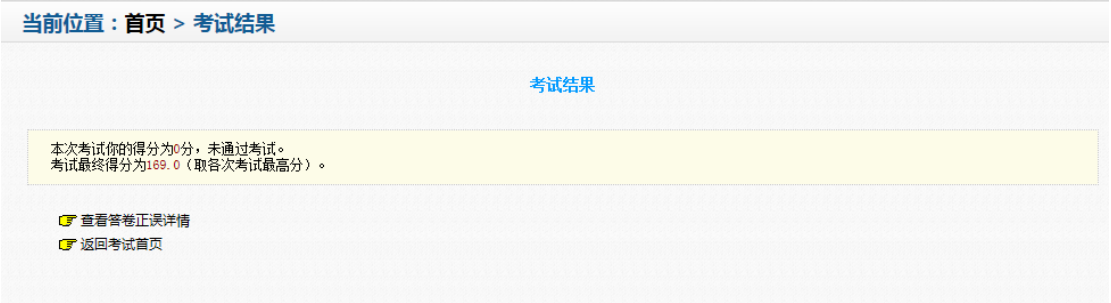 8、显示考试结果即为考试顺利结束,随即方可查看正误详情、返回考试斗地主再次考试或关 闭页面