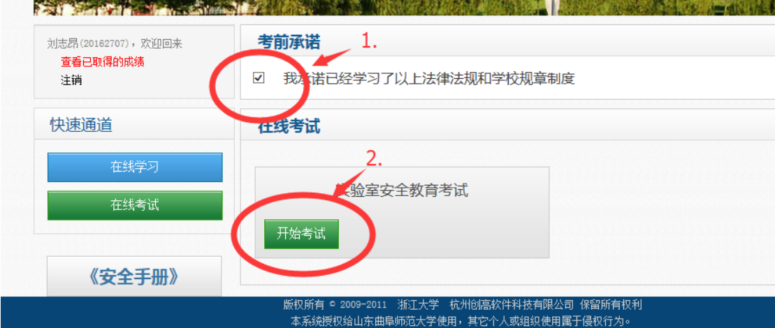 5、勾选“考前承诺”,点击“开始考试按钮”
