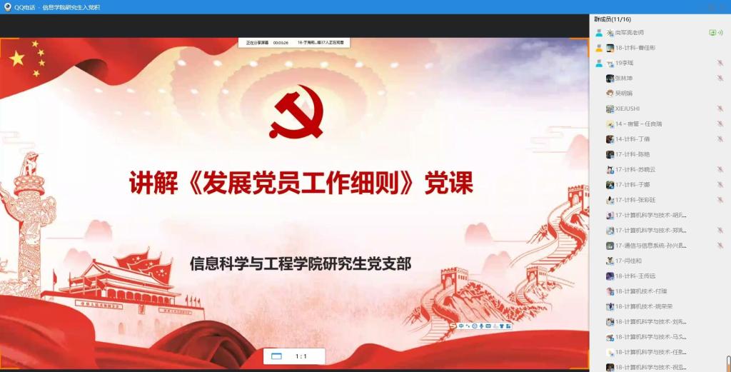 发展党员工作细则》为主题,信息科学与工程学院研究生党支部书记尚军亮出席并担任主讲,支部全体入党积极分子参加了本次党课。