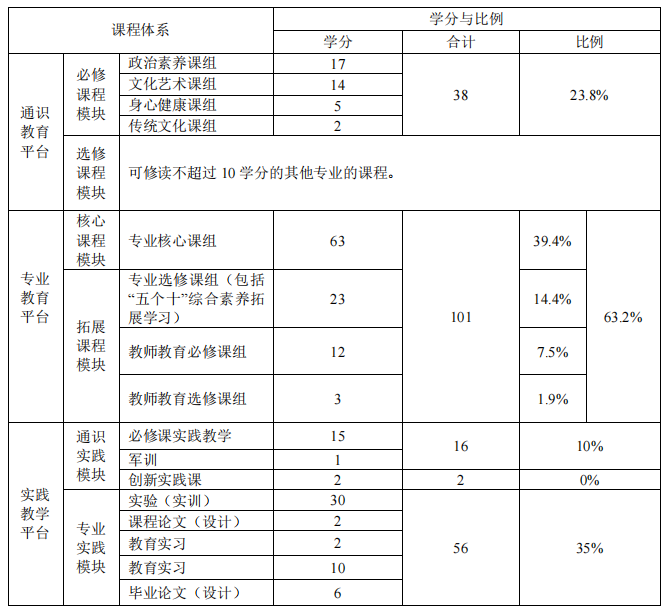教育实习是师范专业学生最重要的实践教学环节,目的是全面培养、提升学生的教育教学能力。安排在第6学期进行,在校模拟实习2~3周,计2学分,到实习学校实习4个月,完成并符合要求,计10学分。
