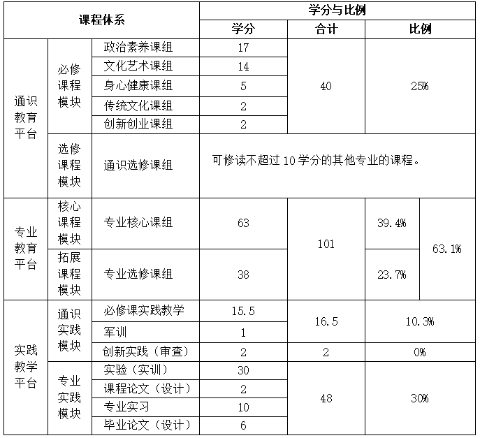 说明:表中通识必修课程模块的40学分中,含通识实践模块中必修课程实践教学的15.5学分;专业教育平台的101学分中,含专业实践模块实验(实训)的学分30学分。