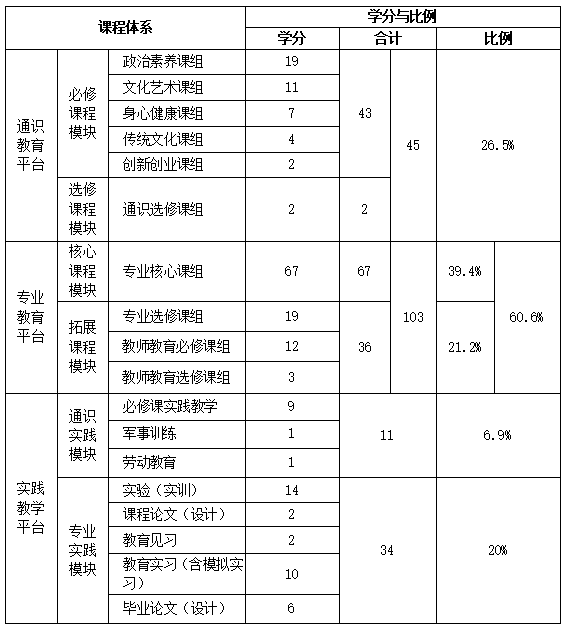 说明:表中通识必修课程模块的43学分中,含通识实践模块中必修课程实践教学的9学分;专业教育平台的103学分中,含专业实践模块实验(实训)的14学分。