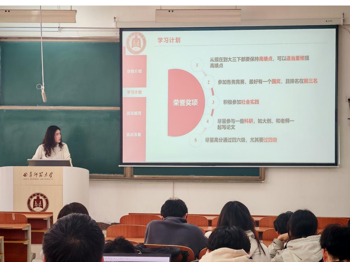 分享会伊始,宋雪燕同学分享了保研经验。她首先介绍了自己的基本情况,让同学们对保研的条件有了直观的认识。在学习计划方面,她建议同学们从现在到大三下都要保持高绩点,积极参加各类竞赛、社会实践和科研活动,同时要尽量高分通过四六级考试。关于简历填写,她详细讲解了教育背景、科研经历、项目经历、竞赛表彰和自我评价等板块的填写要点。在面试准备环节,宋雪燕同学针对英语、综合素质、专业课和心态等方面也给出了实用的建议。