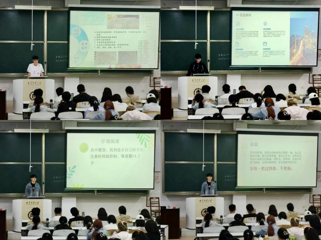 分享会上,三位同学从不同角度为同学们提供了实用的备考建议。王振分享了如何通过日常练习来提升听力理解能力,并推荐了许多高质量的英文听力材料。郝腾从阅读方面出发,分享了迅速定位关键信息、准确把握文章核心的方法,并建议同学们多做历年真题、深入剖析错误来增强阅读能力。丁思凯介绍了写作与翻译的备考策略,建议同学们积累高级词汇和句式,并注重语法和拼写的准确性。同学们认真聆听,积极互动,纷纷表示受益匪浅。