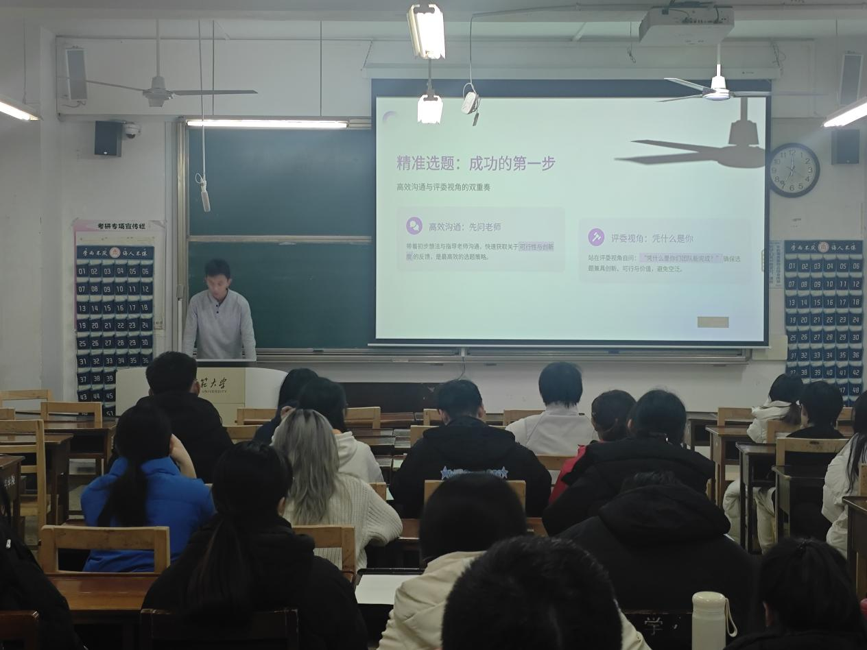 讲座伊始,孙浩林围绕选题与导师选择展开分享。他强调,精准选题是大创项目成功的关键,鼓励同学们带着初步想法主动与指导老师沟通,获取可行性与创新度反馈,同时要站在评委视角审视项目,确保选题兼具创新价值与实操性。在团队组建方面,他建议以学习成长为目标,吸纳能力互补、愿意投入的成员,为项目推进奠定坚实基础。