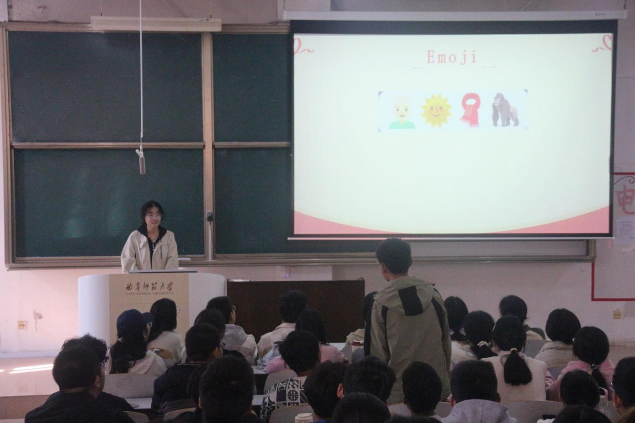本次团日活动还准备了一些新颖的小游戏。在“看图猜历史人物”活动中,历史人物画像一一呈现,团员们热情高涨,展现出对历史知识的渴望和对团日活动的热情;红歌猜猜猜”环节,熟悉的旋律在空气中回荡,每一首红歌都是一部生动的革命教材。“emoji猜事件”模块别出心裁,emoji表情组合出严肃的历史事件,极大地激发了团员们的兴趣和想象力,整个活动现场充满了欢乐和活力。