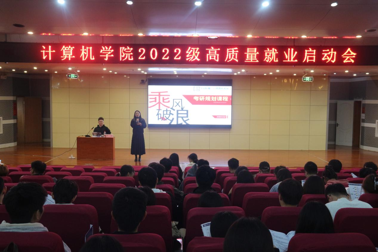 在图书馆报告厅隆重举行2022级高质量就业启动会。本次会议邀请了日照跨考考研机构专业讲师进行指导讲解,2022级全体学生参加。