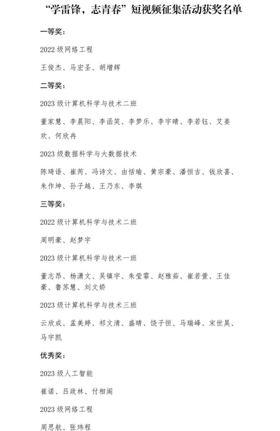 团委学生会决定对在“学雷锋活动月”系列活动中表现突出的志愿者们进行表彰奖励,授予“雷锋月优秀个人”称号,他们分别是:2022级网络工程班王俊杰、2023级数据科学与大数据技术班王朔、2023级数据科学与大数据技术班张凯。这增强了同学们的责任感与使命感,让雷锋精神深入每位同学心中。