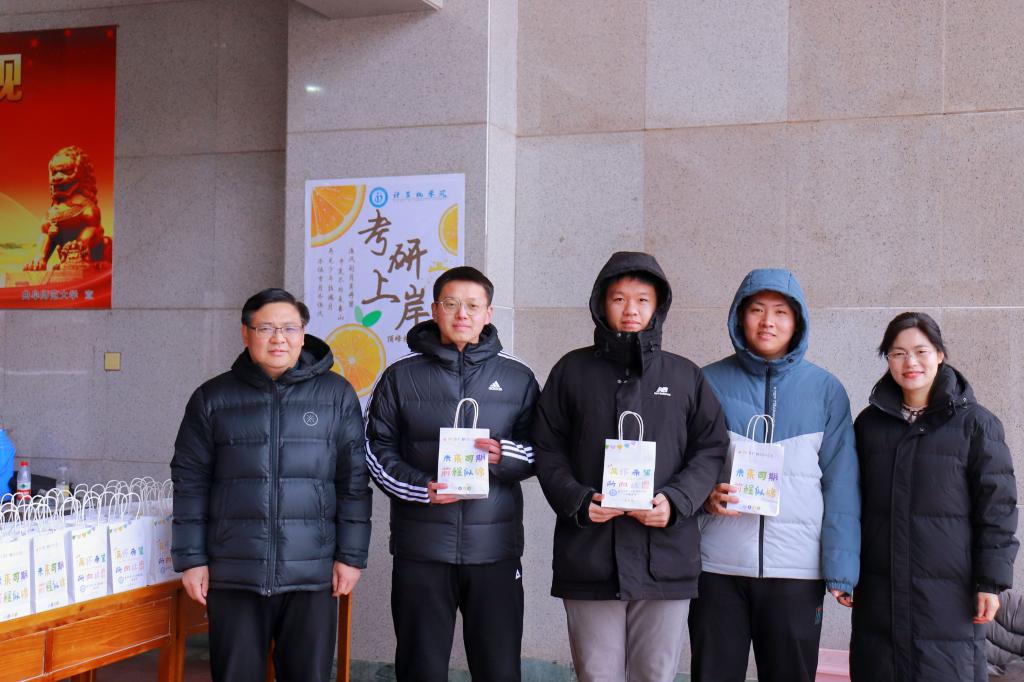 李光顺院长向积极备考的学子表示关心和祝福,对同学们刻苦学习的精神表示赞赏,提醒同学们在最后的冲刺阶段,要劳逸结合,放平心态,从容应对。于运清老师表示,无论同学们考试结果如何,学院都是他们坚强的后盾。刘兆宇老师也表示,希望这份小小的礼物能带给学生们好运,助力他们在考试中取得好成绩。