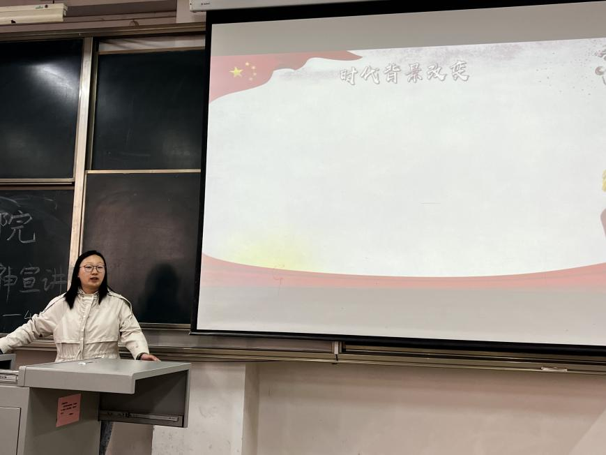 之后由学院宣讲成员进行宣讲,宣讲成员从二十大入手,首先对二十大总体总体思路入手,从传统文化入手进行二十大解读,中途以习近平同志对青年学生的寄语引出五四精神,从青年学生责任以及观看“青春在我,青春有我”主题短片加深对五四青年精神的理解。