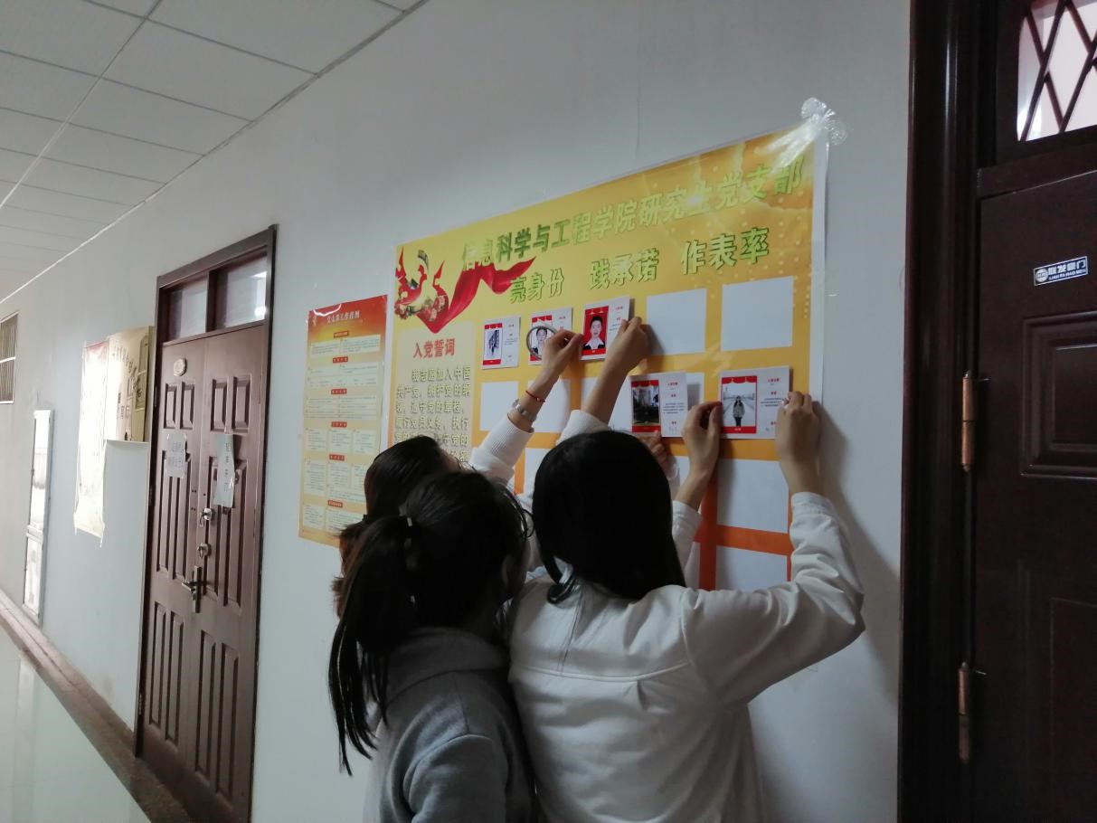 亮身份,强化党员意识,监督承诺实效。本次活动,信息科学与工程学院研究生党支部统一制作了“亮身份,践承诺,作表率”的名牌海报,将支部党员的姓名、照片形象和“一句话承诺”等内容公布,向广大老师同学公布,督促研究生党员时刻牢记自己的政治身份,以党员的标准严格要求自己,认真履行党员义务,发挥先锋模范作用,并能积极主动地接受广大同学的监督与批评,真正做到亮身份、践承诺,树立党员模范形象。
