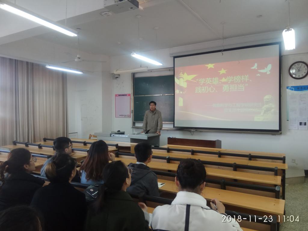 为认真学习习近平总书记重要指示精神和先进典型英雄事迹,2018年11月23日上午,信息科学与工程学院研究生党支部组织全体党员在C楼401教室开展“学英雄、学榜样、践初心、勇担当”主题党日活动。