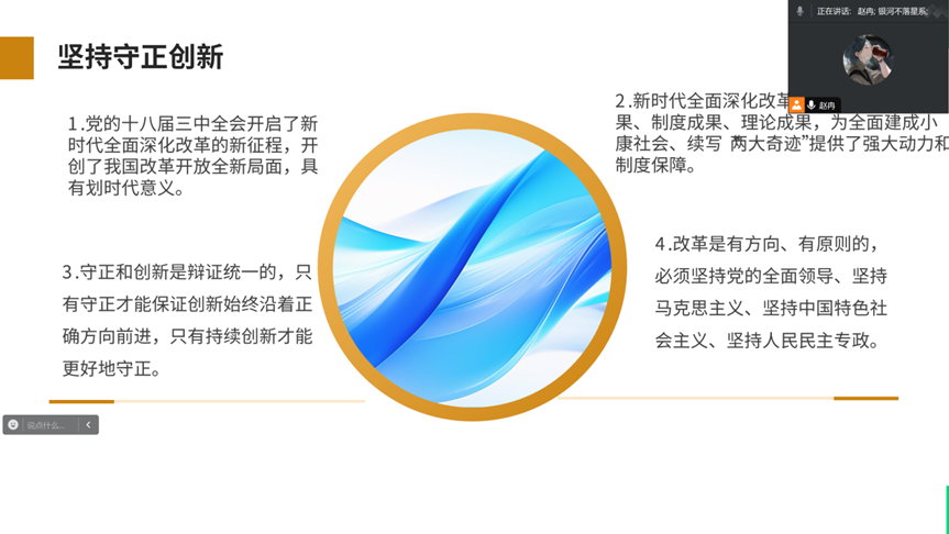 活动中,赵冉围绕新时代全面深化改革的关键要点展开深入讲解。在阐述全面深化改革的重要原则时,赵冉强调,改革有明确方向和原则,要坚持党的全面领导、马克思主义、中国特色社会主义以及人民民主专政。同时,守正与创新辩证统一,党员需深刻领会,在实际中坚持守正创新,助力改革事业发展。