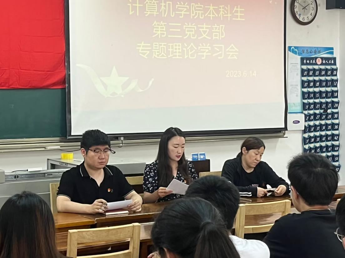 本科生第三党支部于JC412召开专题理论学习会。本次会议由第三支部书记杨丹丹主持,支部全体党员参加。