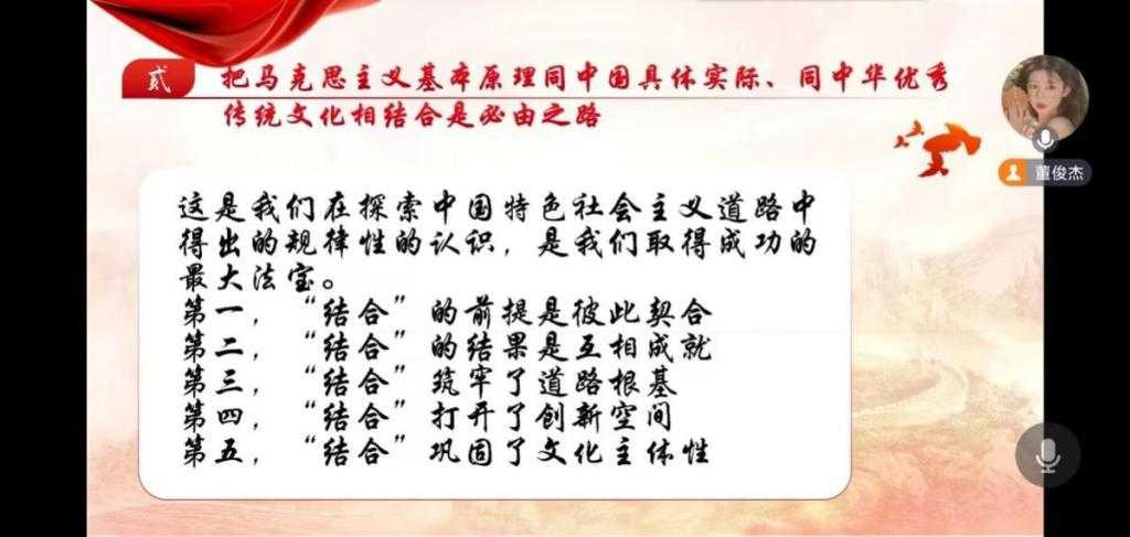 会议伊始,党秘董俊杰指出本次线上主题党课的主题为“学习习近平总书记在文化传承发展座谈会上的重要讲话”。在讲话中,习近平总书记强调,在新的起点上继续推动文化繁荣、建设文化强国、建设中华民族现代文明,是我们在新时代新的文化使命。广大党员要始终坚定文化自信、担当使命、奋发有为,共同努力创造属于我们这个时代的新文化,建设中华民族现代文明。