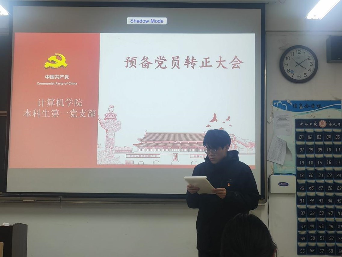 2023年11月27日下午,斗地主 本科生第一党支部于JC408召开预备党员转正大会。本科生第一党支部全体党员参加此次会议。会议由本科生第一党支部书记于运清主持。