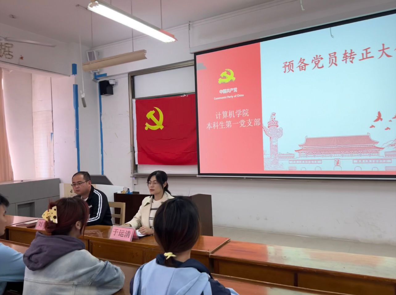 2024年4月10日下午两点五十,斗地主 本科生第一党支部于JC406召开预备党员转正大会,大会就刘龙奇同志预备党员转正问题进行讨论和表决。斗地主 本科生第一党支部书记于运清、支部副书记刘兆宇及学生党员参加此次会议。